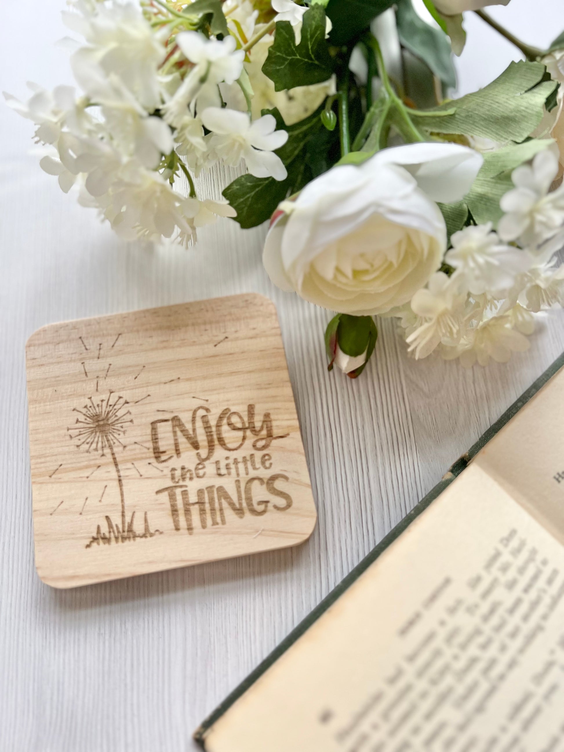 A beautiful wooden coaster with engraving “enjoy the little things”