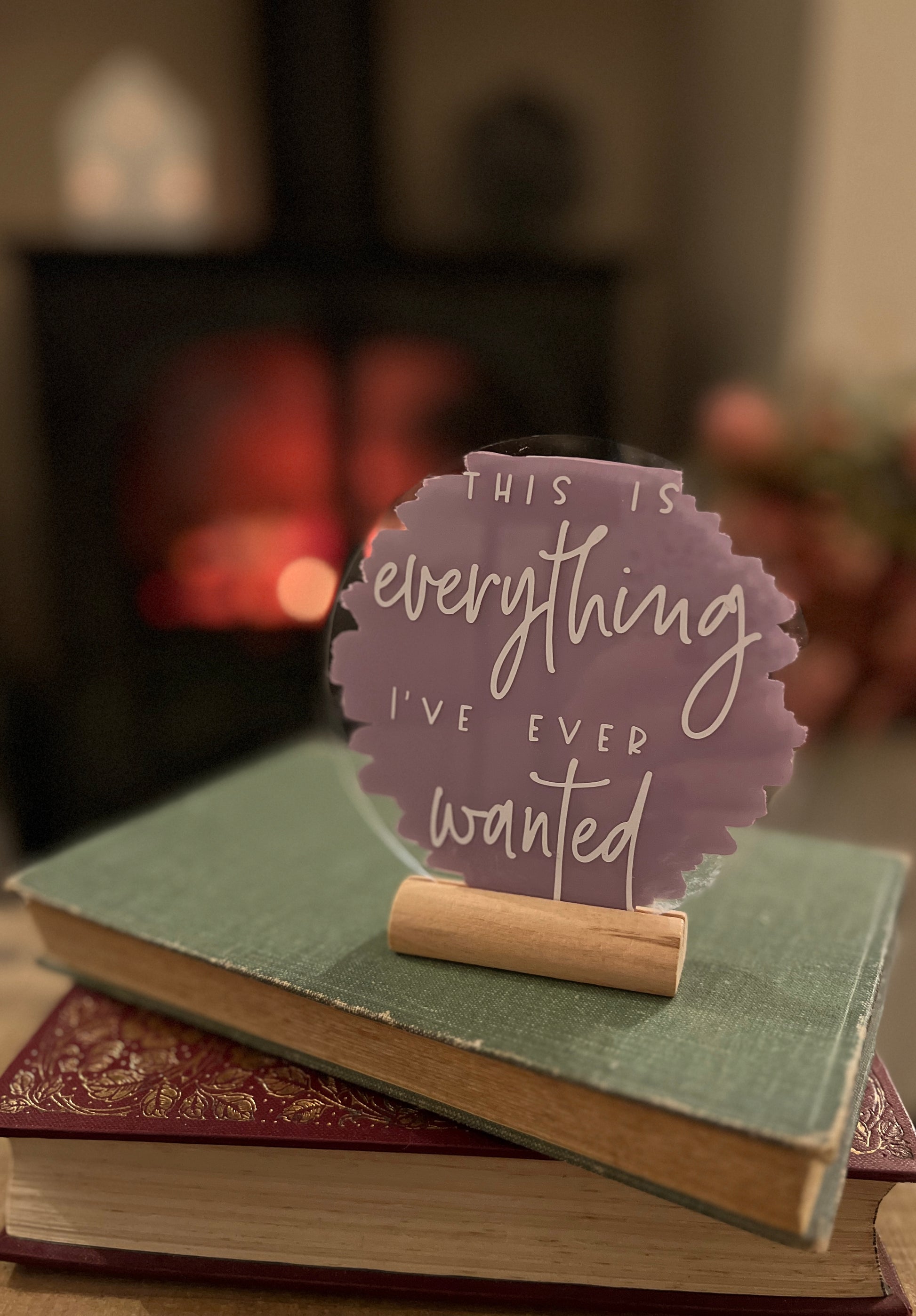 A beautiful 4” acrylic plaque set on a complimentary wooden block with wording “This is everything I’ve ever wanted”