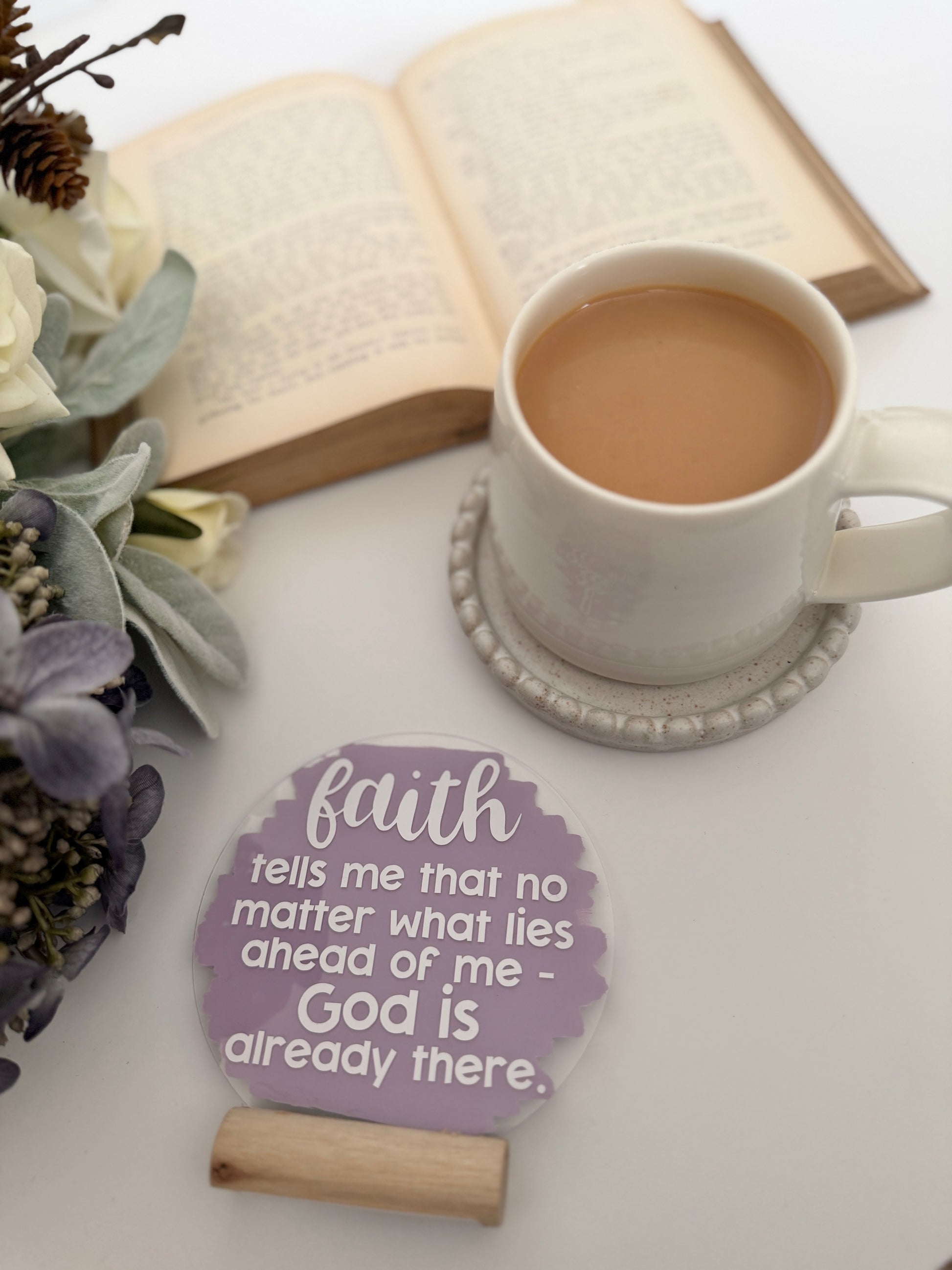 A beautiful 4" acrylic Christian plaque on wooden stand - to have sitting on a windowsill, side table, bookshelf or mantle. The perfect encouragement gift for someone going through a difficult time.