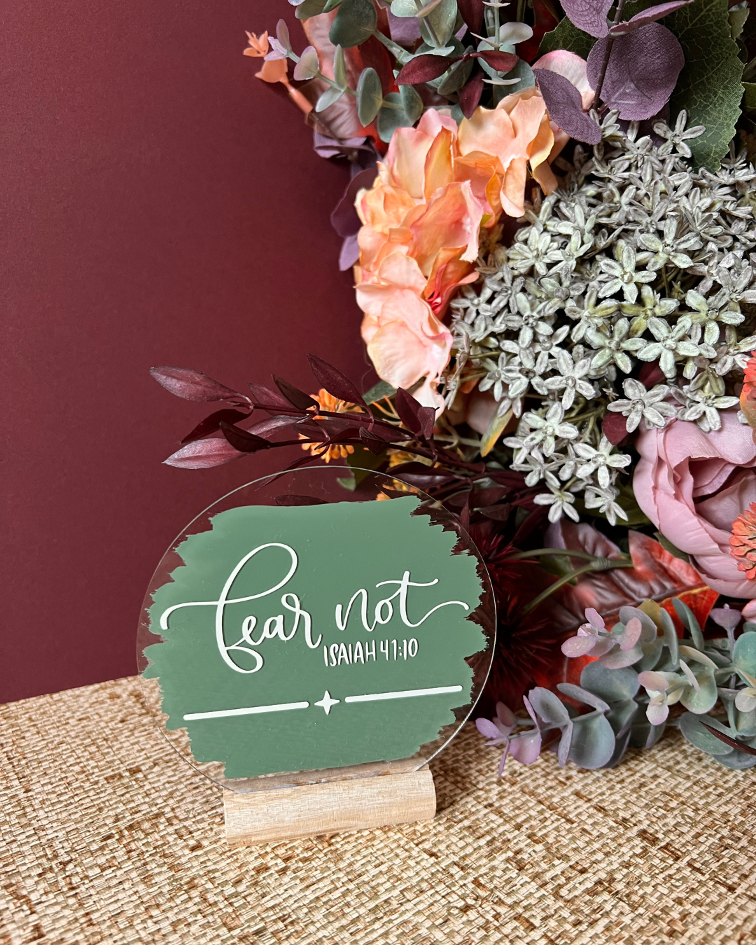 4” acrylic plaque set on a wooden block with wording “Fear not. Isaiah 41:10”