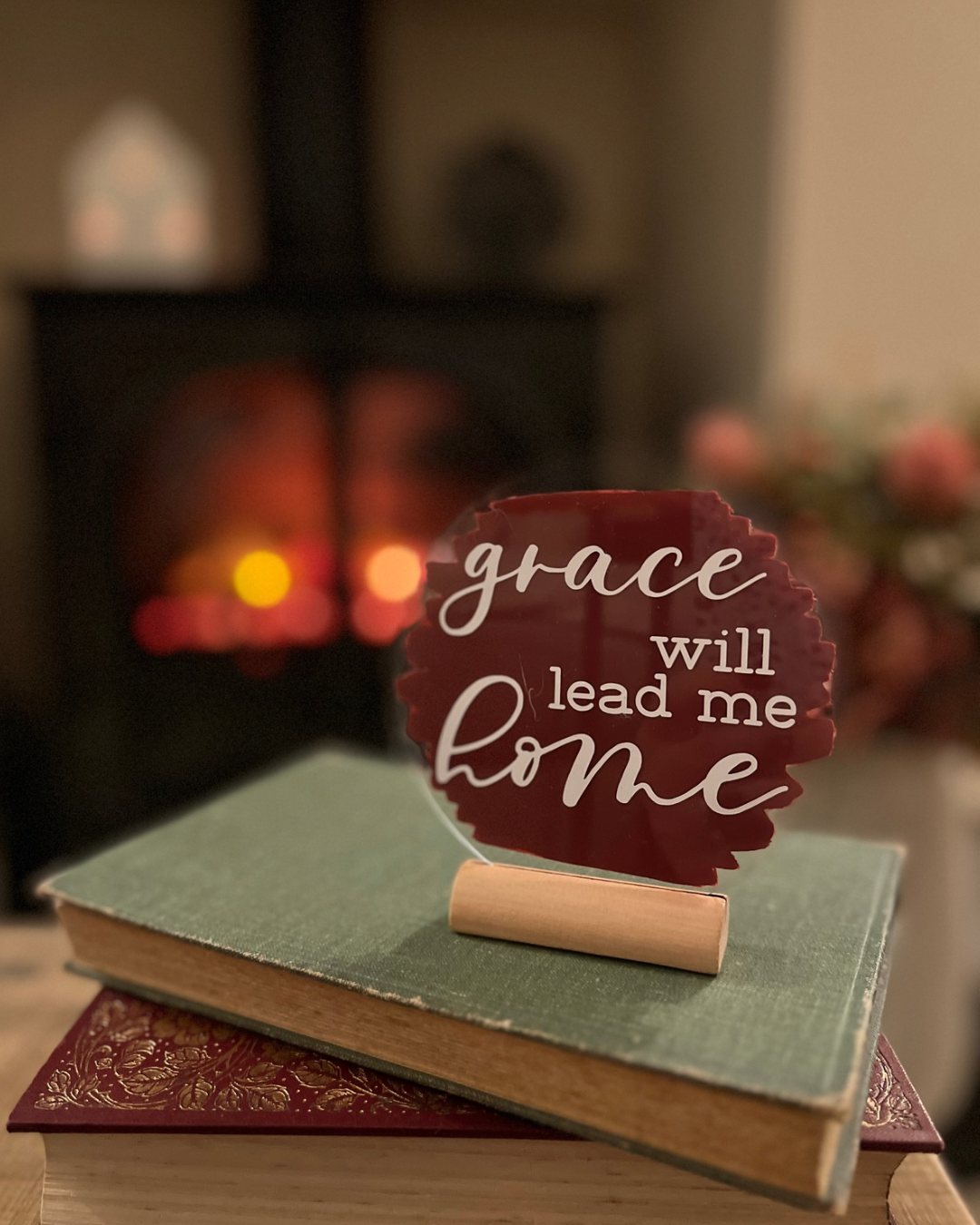 4” acrylic plaque set on a wooden block with wording “Grace will lead me home”