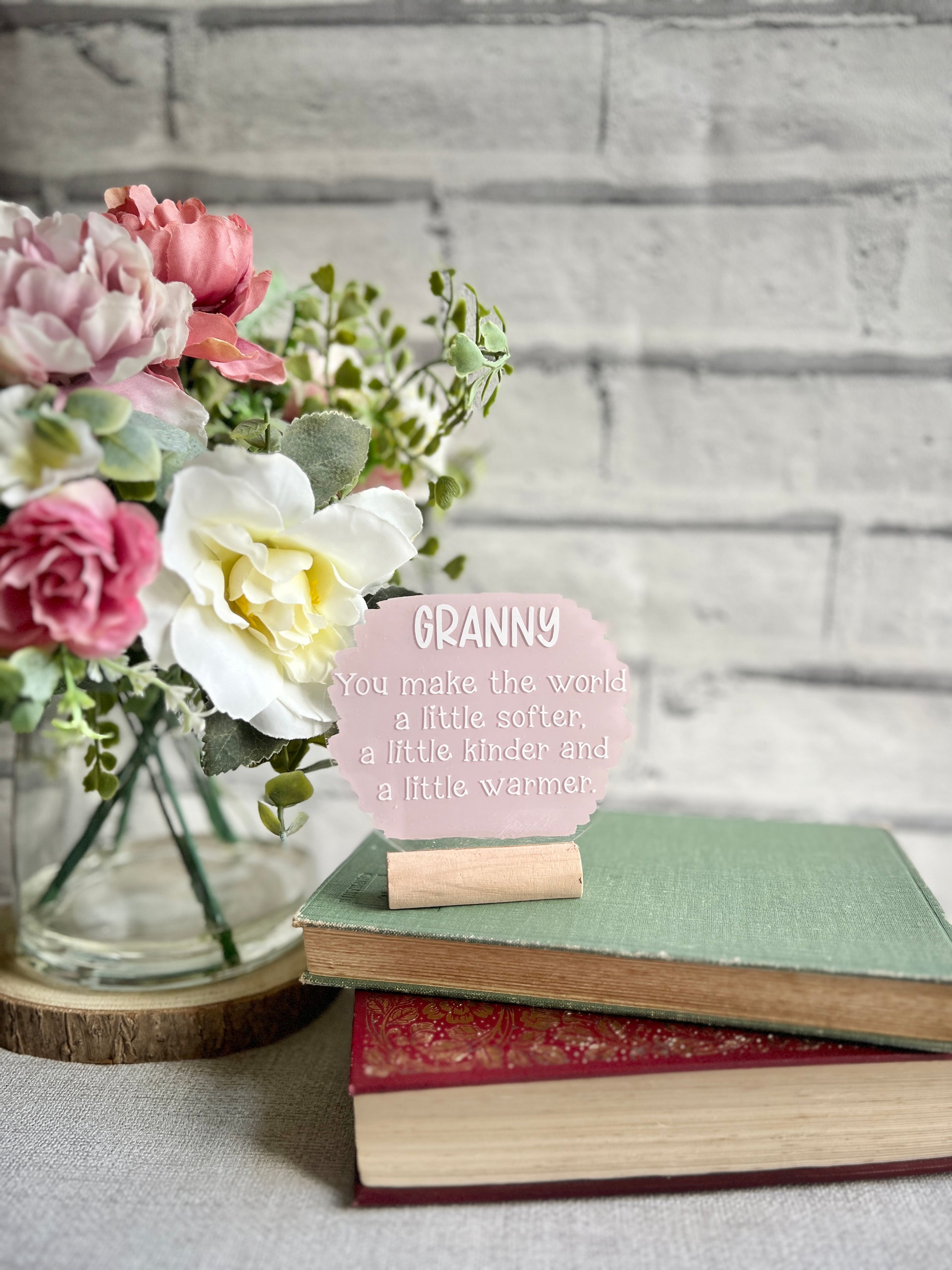 This freestanding 4” acrylic plaque sits on a complimentary wooden block with the words “Granny. You make the world a little softer, a little kinder and a little warmer”