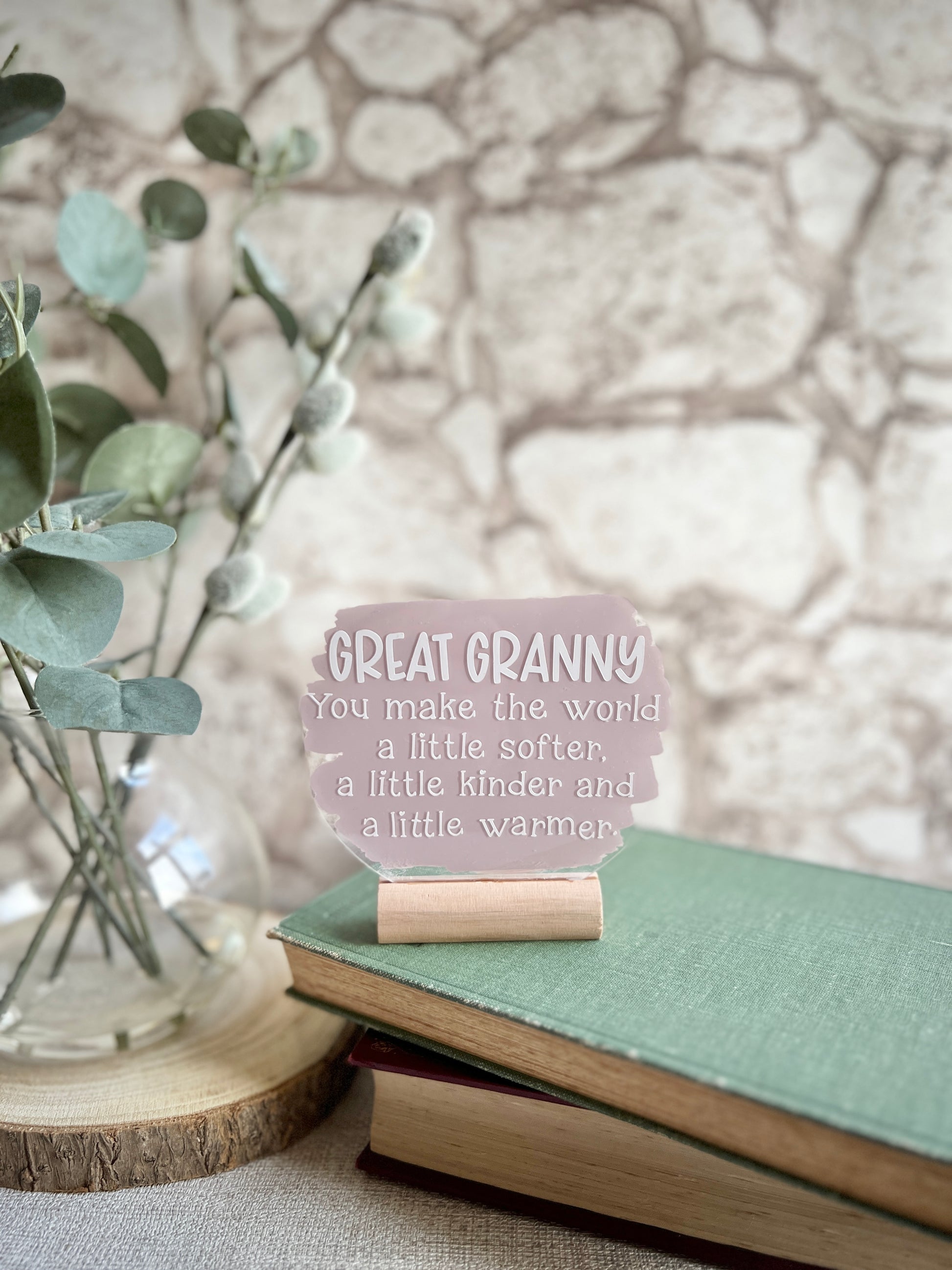 This freestanding 4” acrylic plaque sits on a complimentary wooden block with the words “Great Granny. You make the world a little softer, a little kinder and a little warmer”