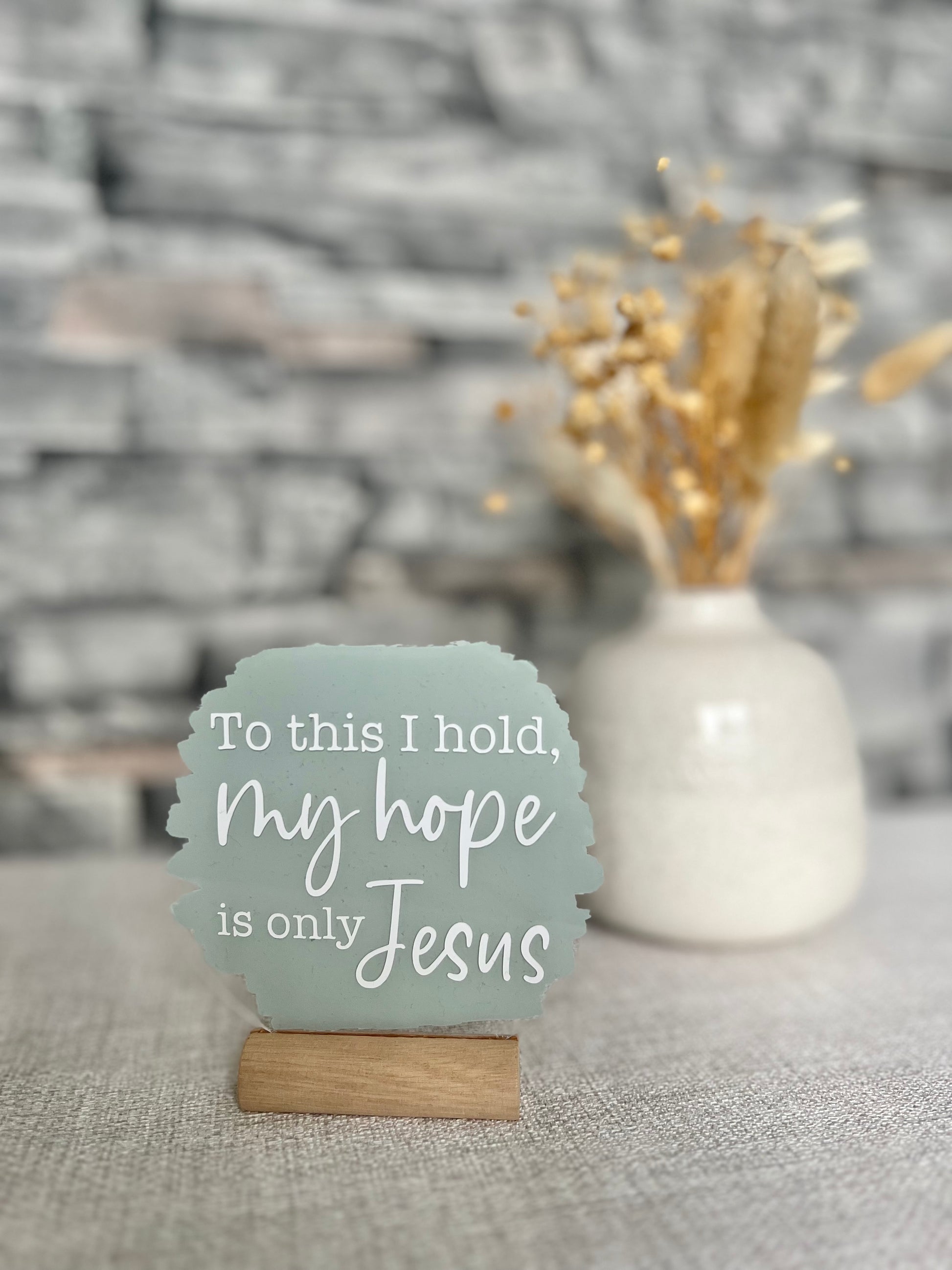 A beautiful 4" acrylic Christian plaque on wooden stand - to have sitting on a windowsill, side table, bookshelf or mantle. The perfect encouragement gift for someone going through a difficult time.