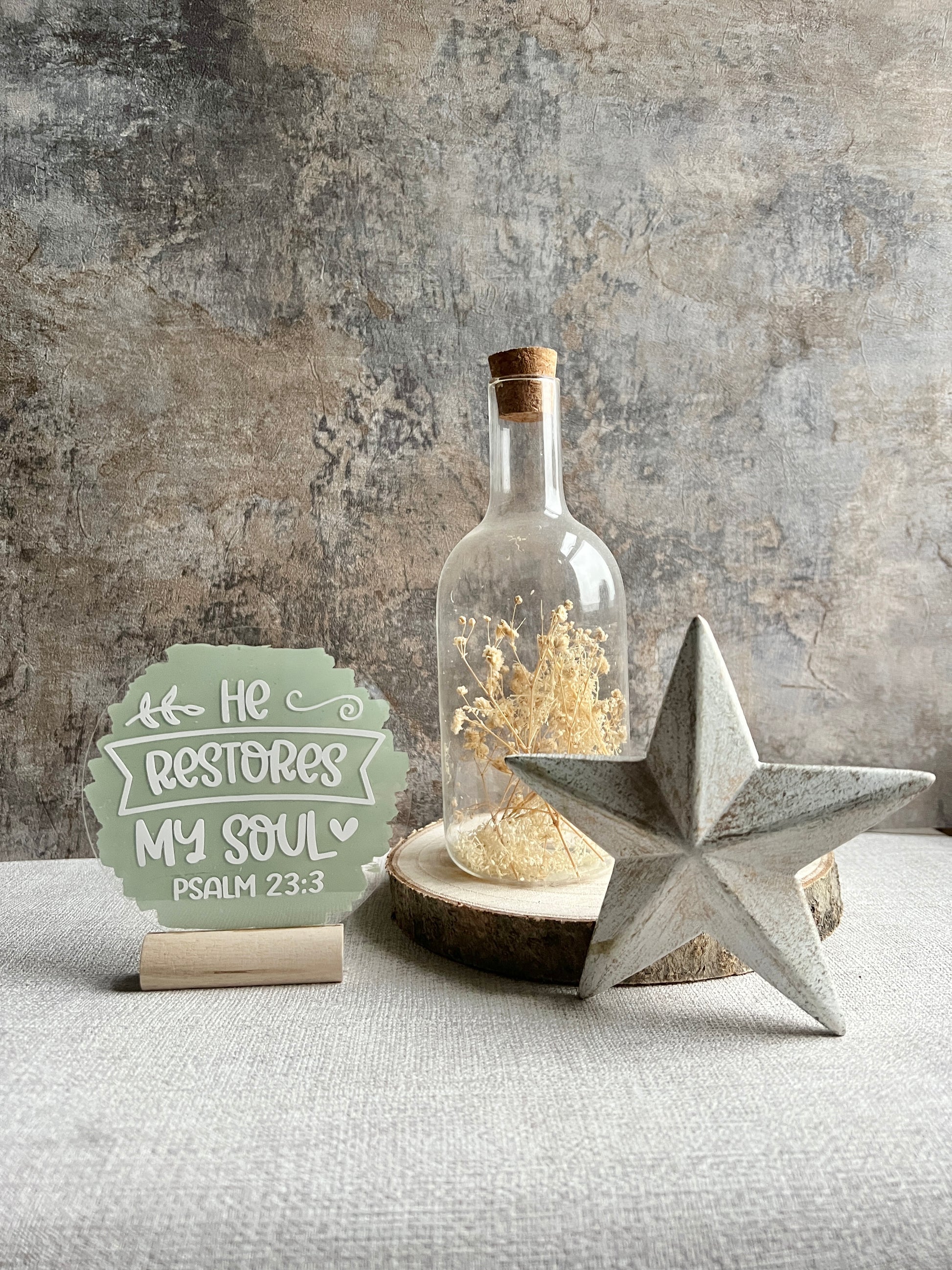 A beautiful 4" acrylic Christian plaque on wooden stand - to have sitting on a windowsill, side table, bookshelf or mantle. The perfect encouragement gift for someone going through a difficult time.