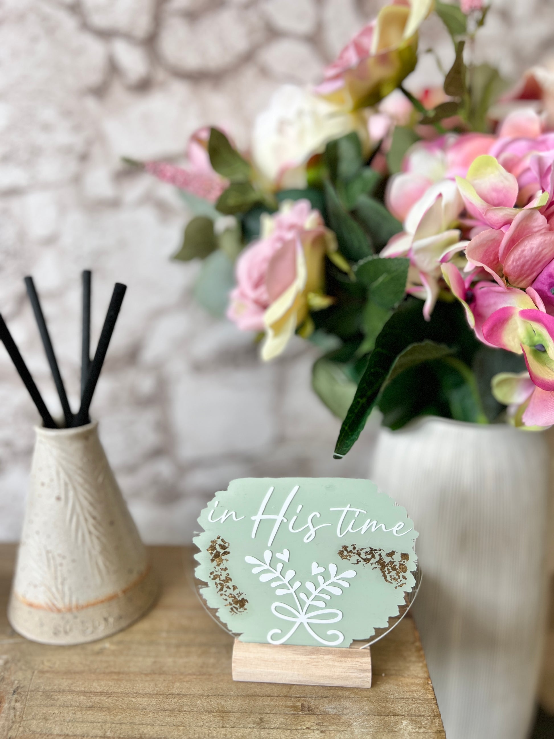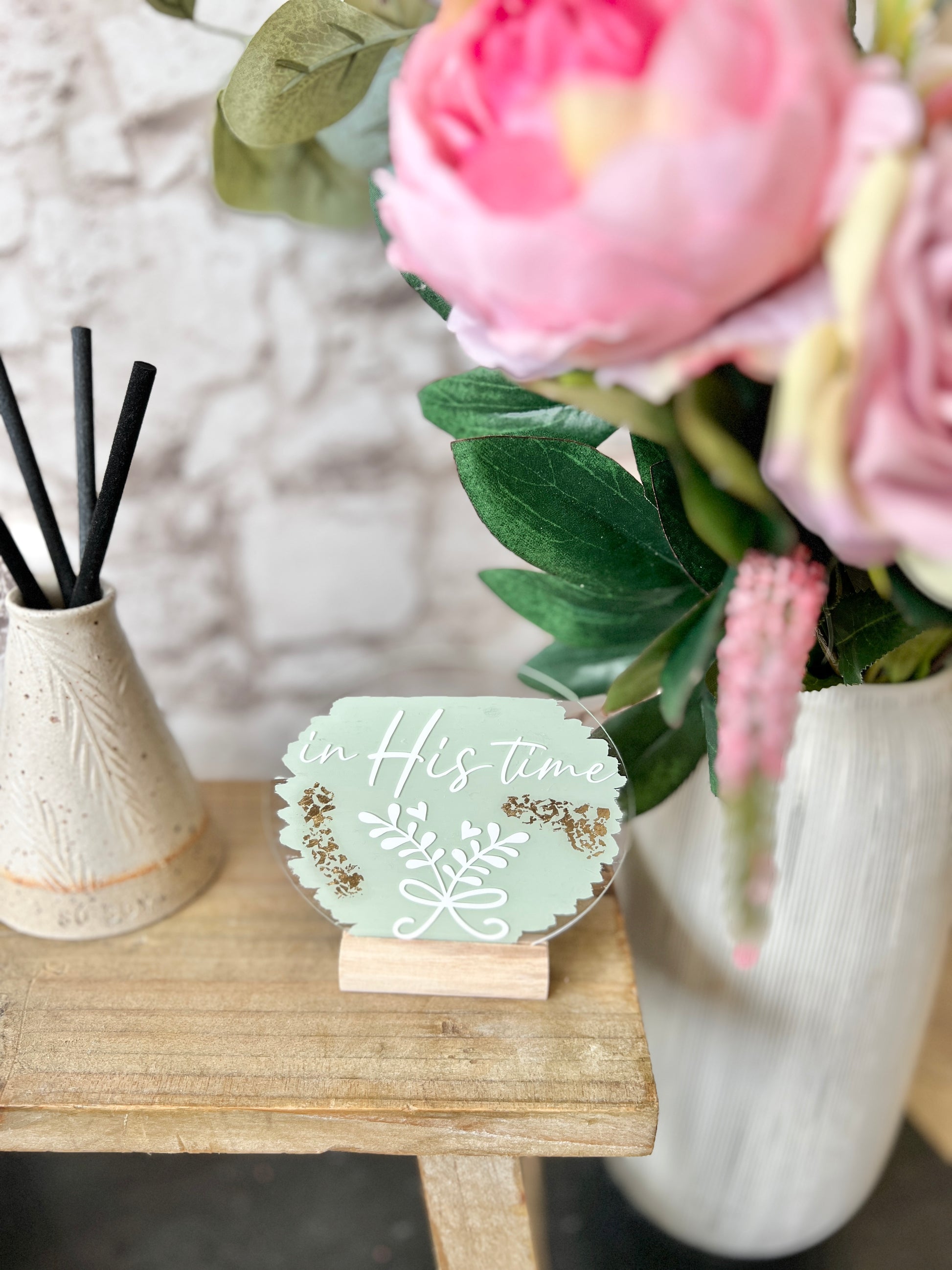 A beautiful 4" acrylic Christian plaque on wooden stand - to have sitting on a windowsill, side table, bookshelf or mantle. The perfect encouragement gift for someone going through a difficult time.