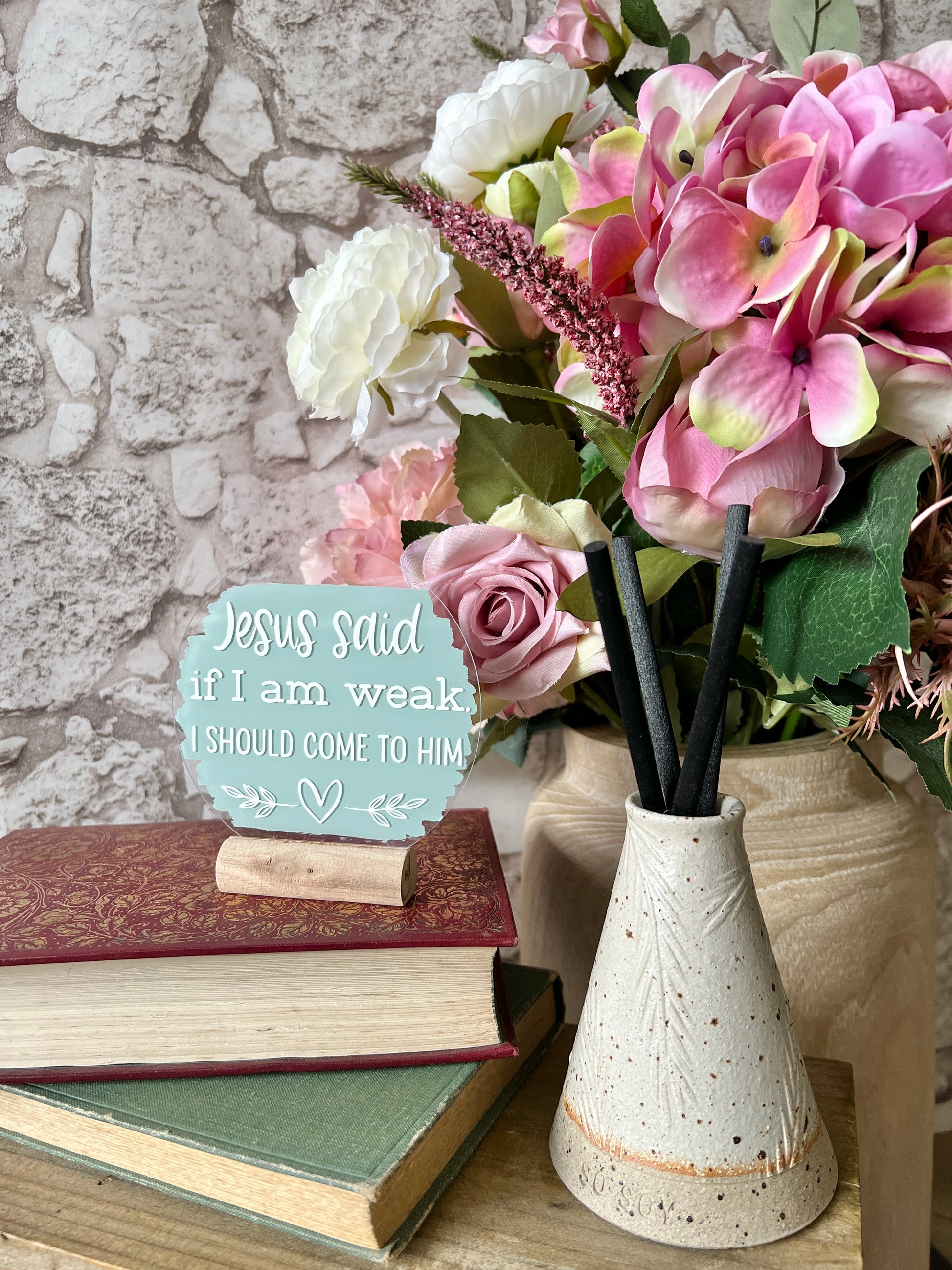 4” acrylic plaque set on a wooden block with wording “Jesus said if I am weak, I should come to Him”