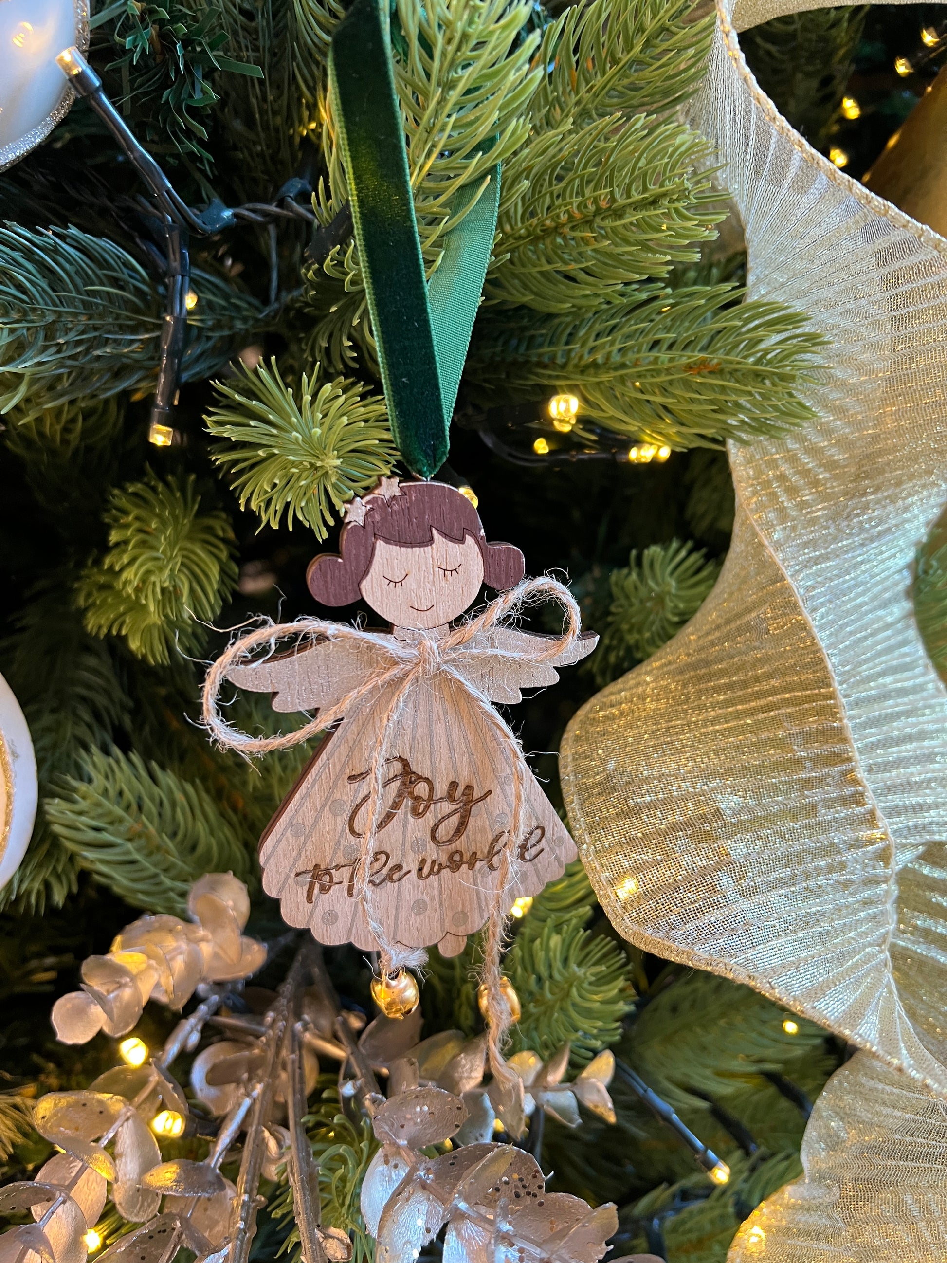 Add the perfect finishing touch to your Christmas tree with this limited edition engraved wooden angel with golden bells and a velvet ribbon, featuring engraving “Joy to the World”