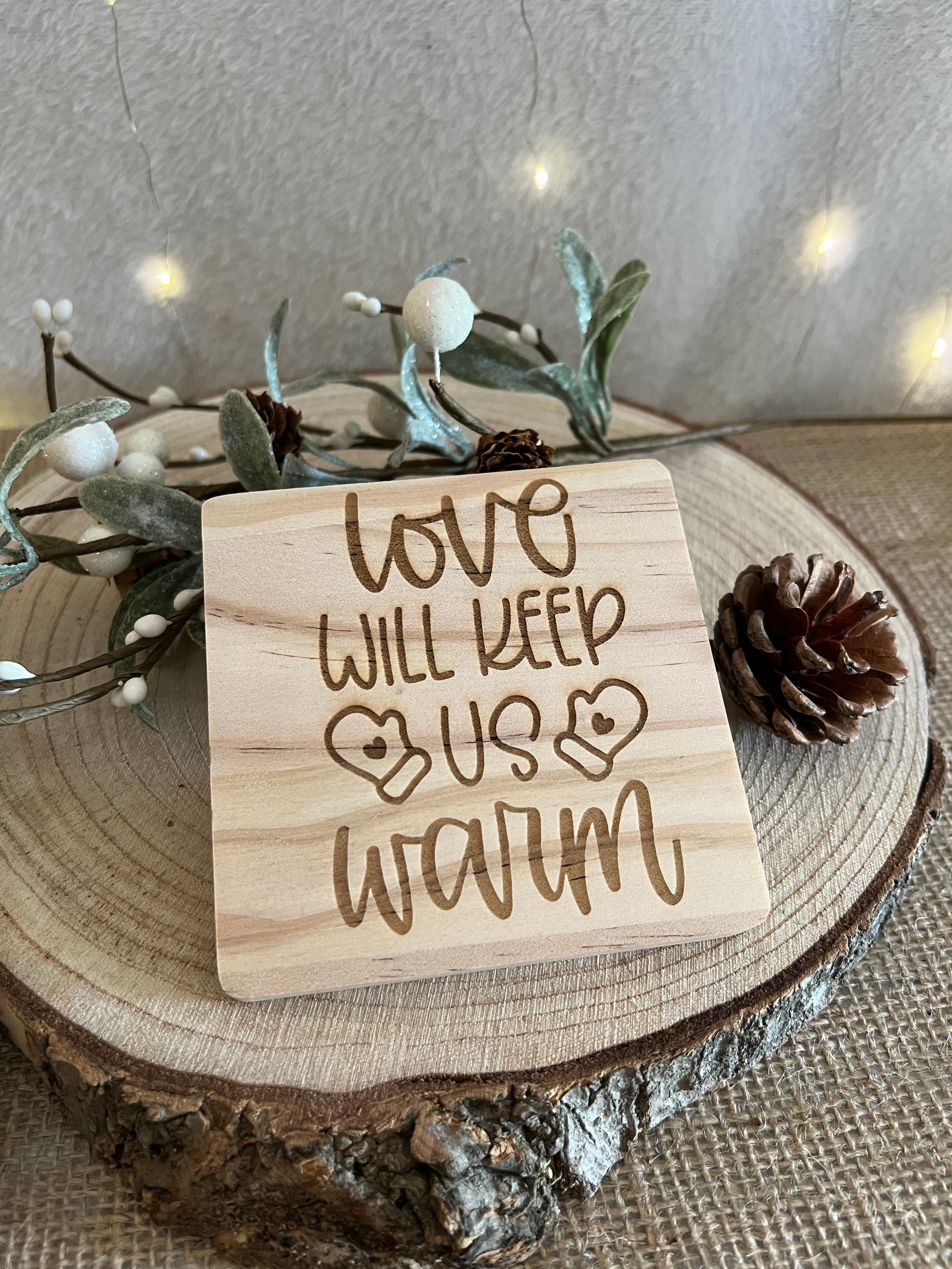 Love will keep us warm wooden engraved coaster