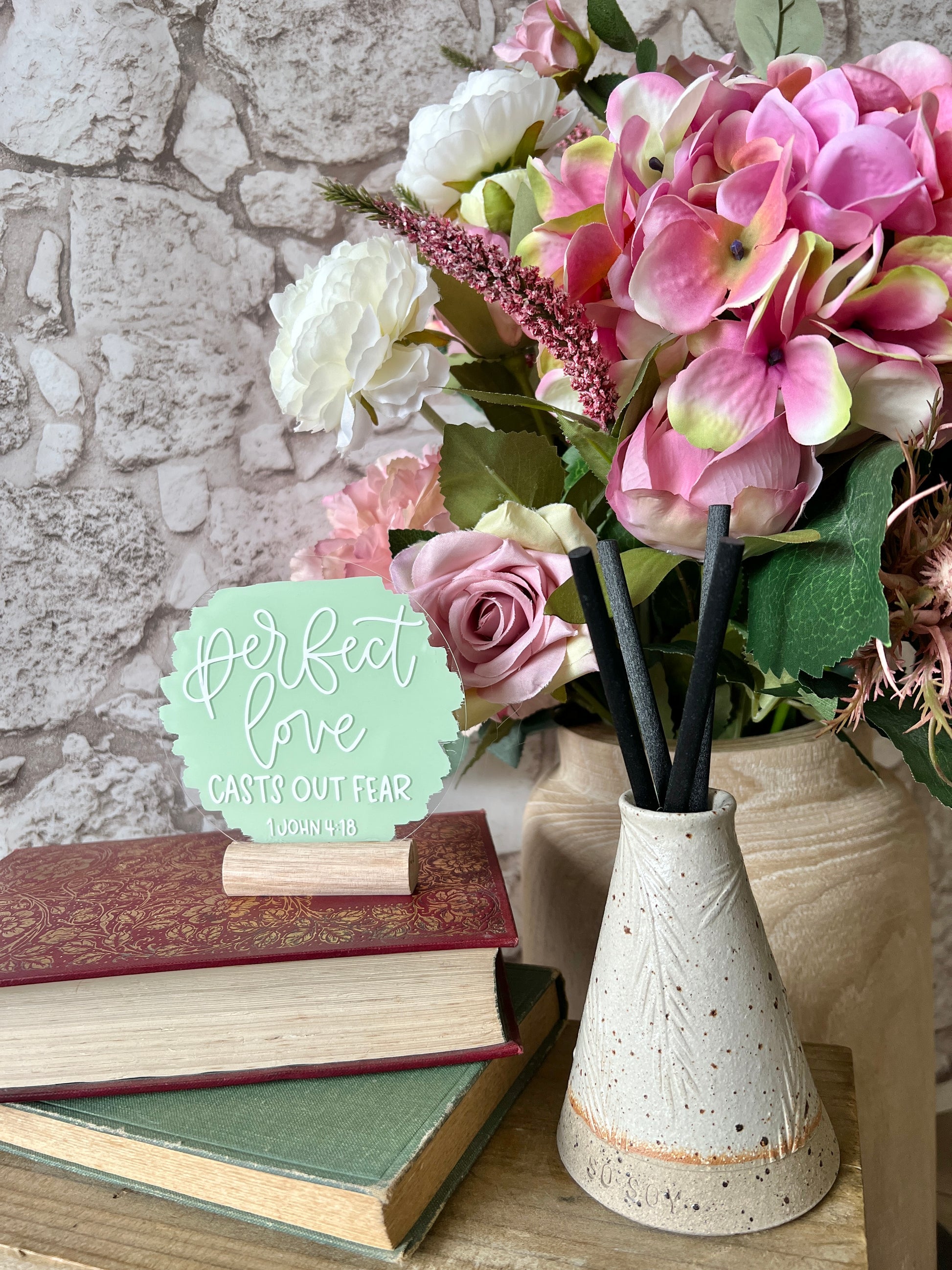 4” acrylic plaque set on a wooden block with wording “Perfect love casts out fear. 1 John 4:18”
