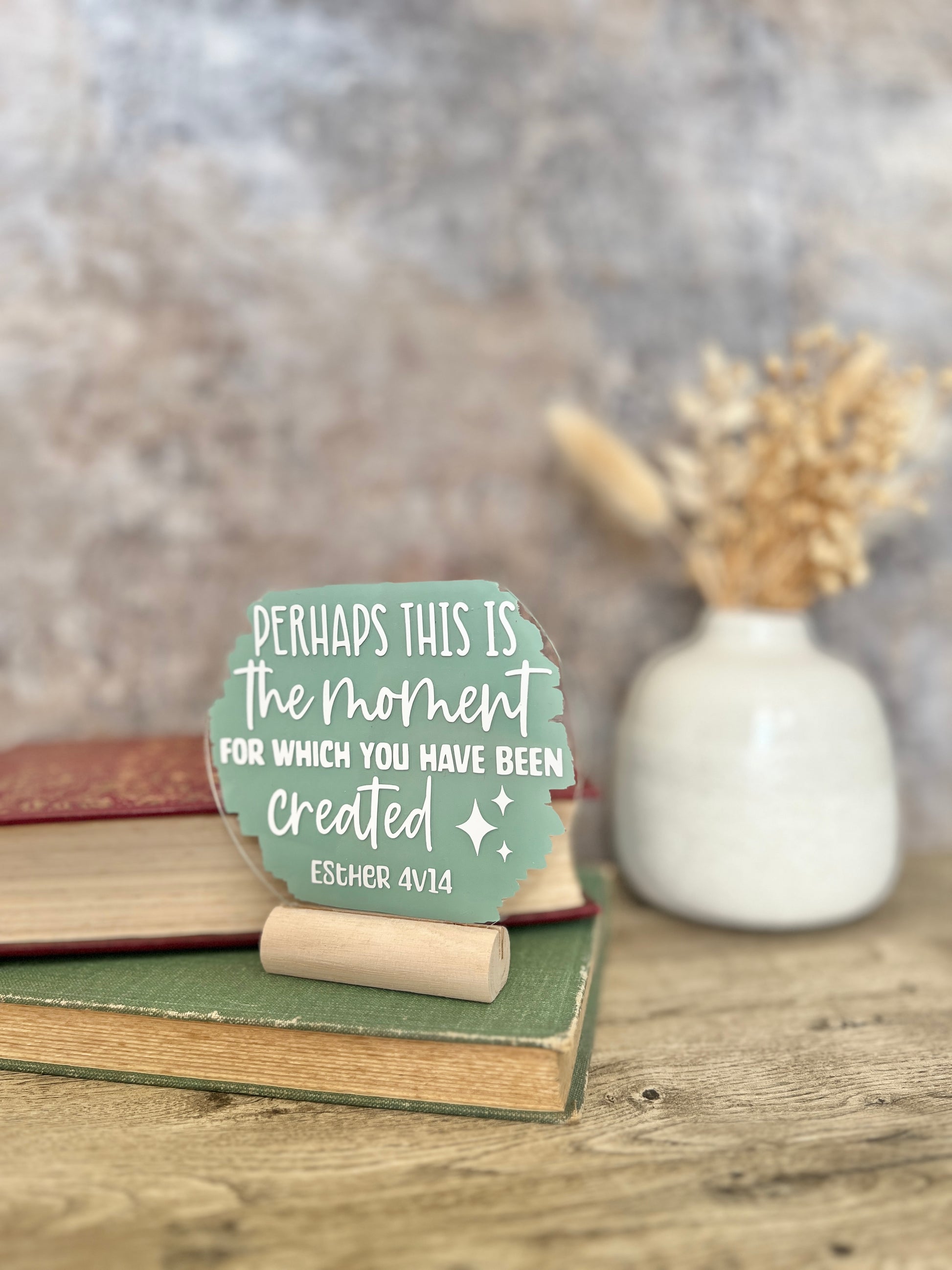 A beautiful 4" acrylic Christian plaque on wooden stand - to have sitting on a windowsill, side table, bookshelf or mantle. The perfect encouragement gift for someone going through a difficult time.