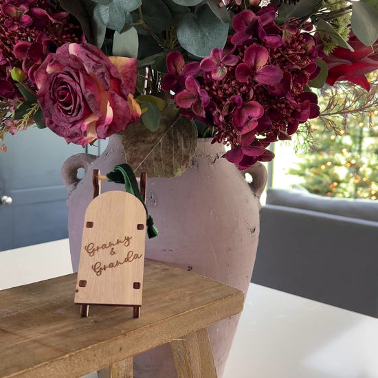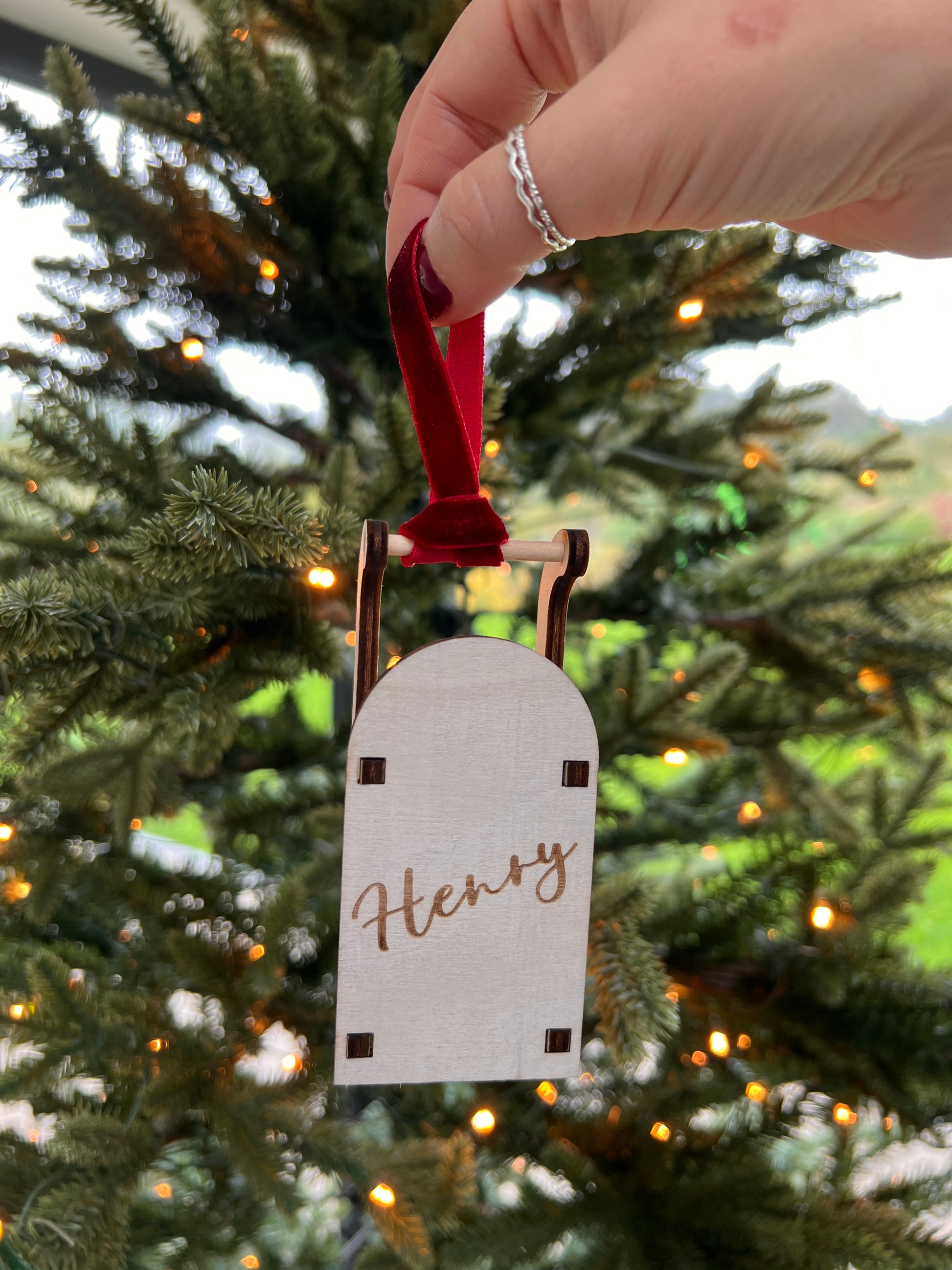 This limited edition engraved wooden sleigh tree decoration is the perfect keepsake. The decoration comes with a luxury burgundy or bottle green velvet ribbon to attach to the tree.