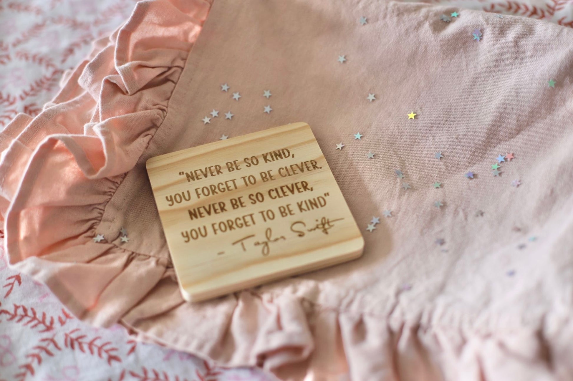 Immerse yourself in the lyrical wisdom of Taylor Swift with our exquisite engraved wooden coaster featuring the poignant lyrics, "Never be so kind, you forget to be clever. Never be so clever, you forget to be kind." Measuring 10cm x 10cm, this coaster is a captivating addition to your home decor. Crafted with precision and care, it serves as both a functional drink accessory and a profound statement piece. Made from high-quality wood and adorned with intricate engraving, it radiates elegance and charm. Elevate your coffee table or desk with this timeless treasure, a thoughtful gift for any Taylor Swift enthusiast.