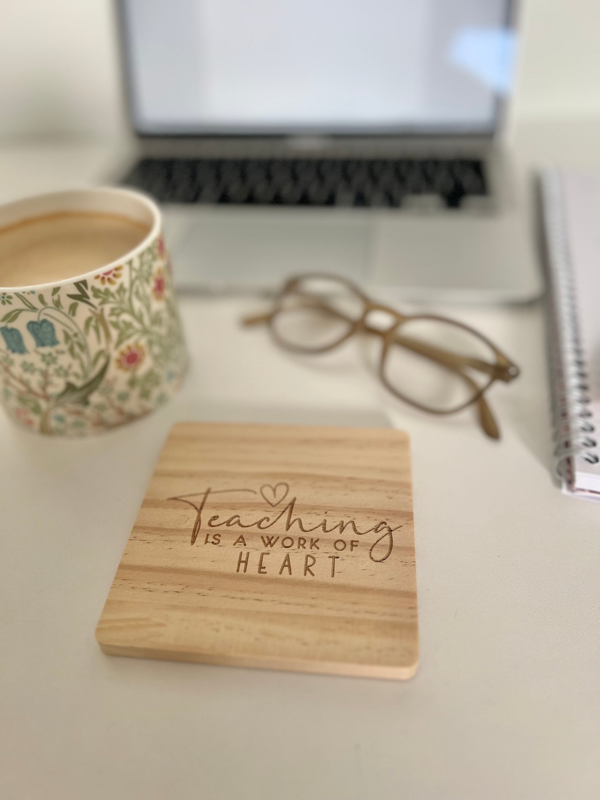 A beautiful 4” square wooden coaster engraved with the words “teaching is a work of heart”