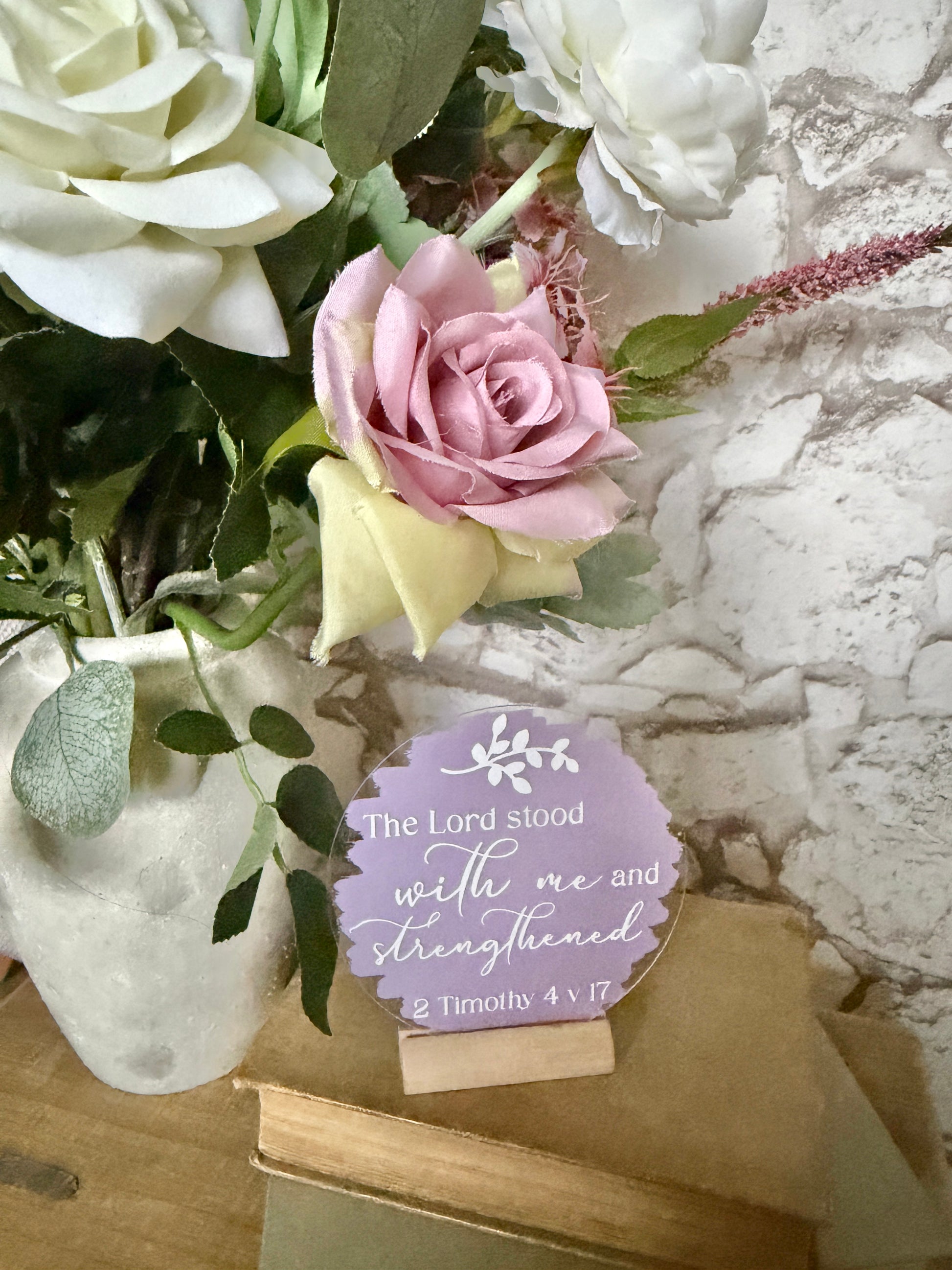 4” acrylic plaque set on a wooden block with wording “The Lord stood with me and strengthened me. 2 Timothy 4 v 17”