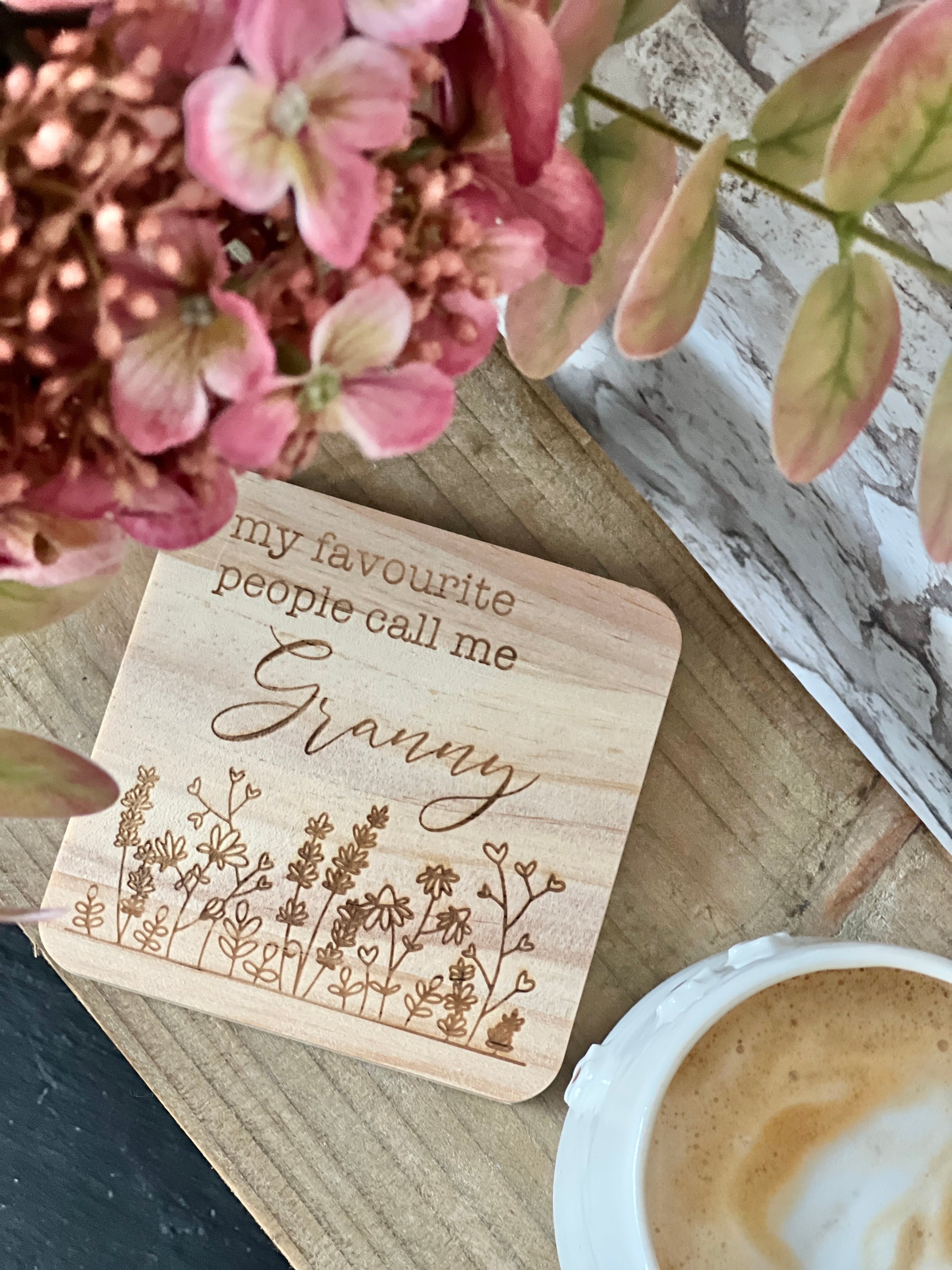 This 4" square wooden coaster features the phrase "my favourite people call me Granny" and delicate wildflowers.