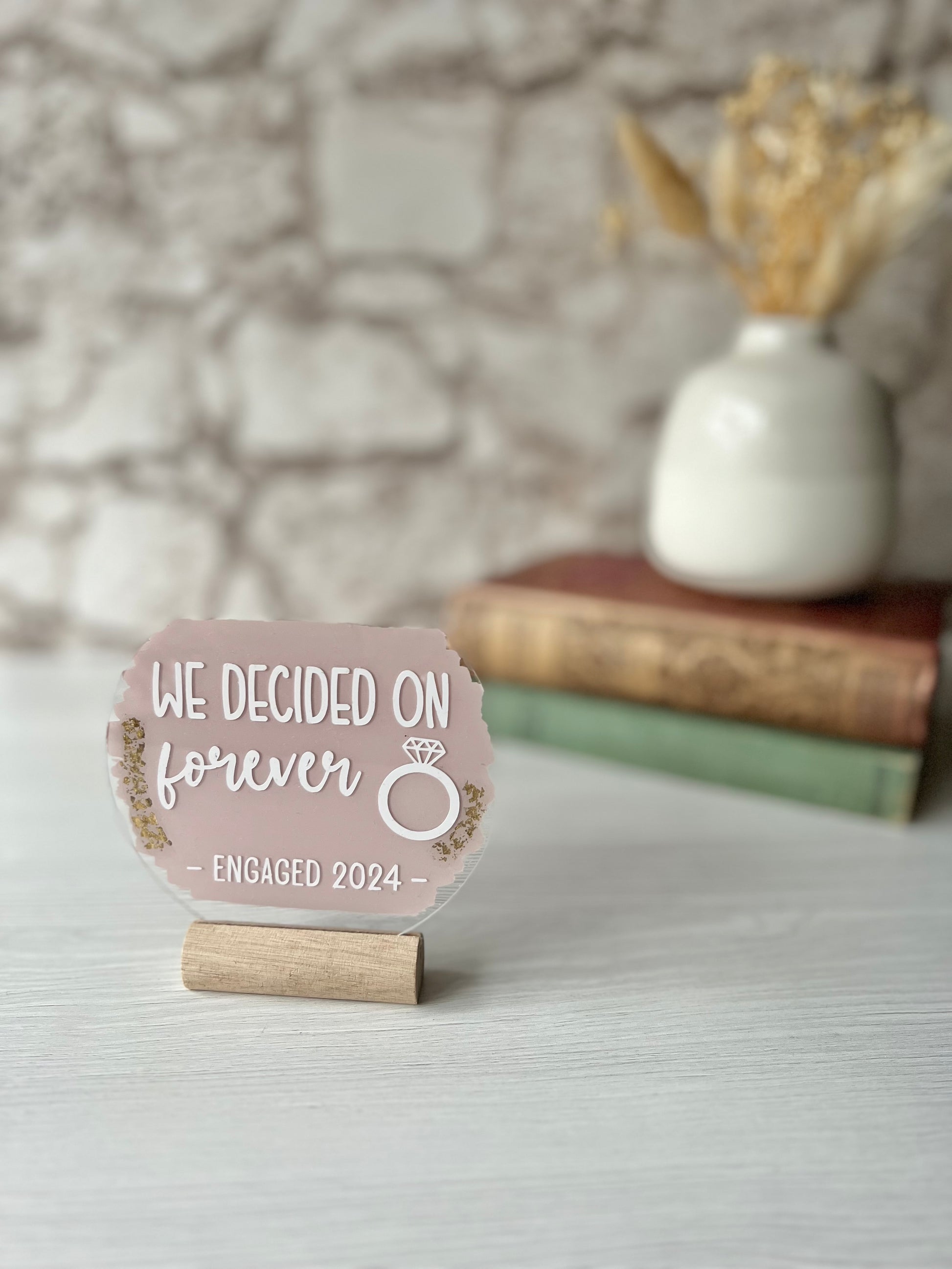 A 4” acrylic plaque set on a wooden block with wording “We decided on forever. Engaged 2024”