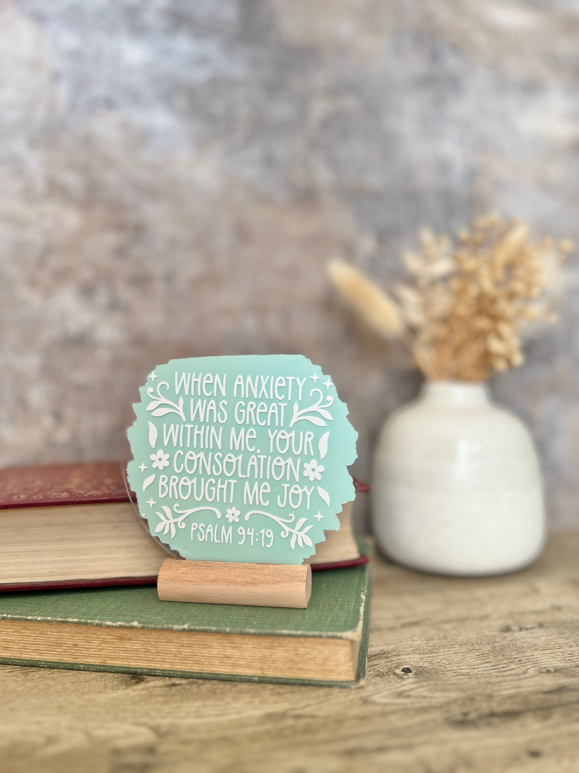 A beautiful 4" acrylic Christian plaque on wooden stand - to have sitting on a windowsill, side table, bookshelf or mantle. The perfect encouragement gift for someone going through a difficult time.