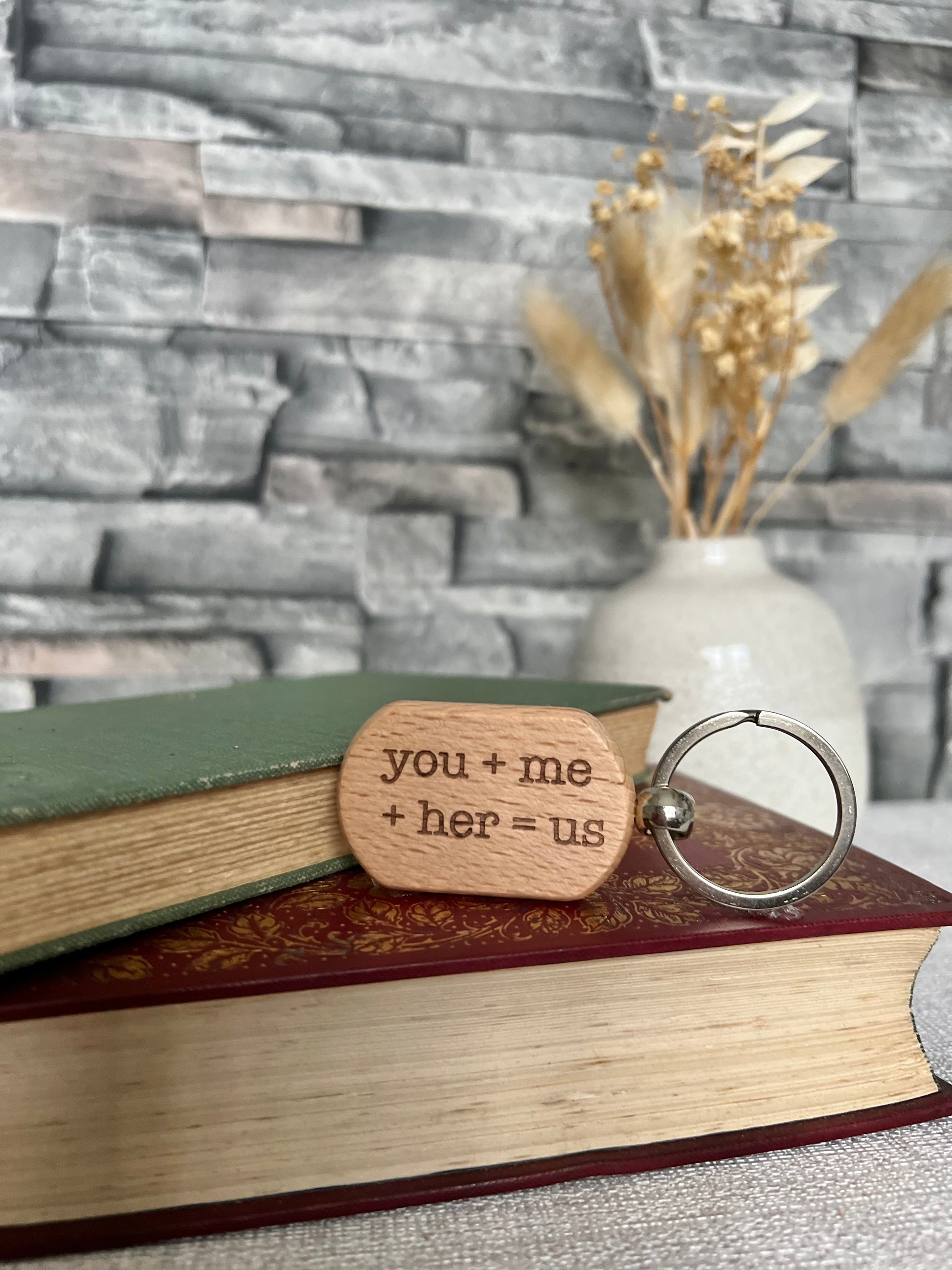You + Me + Her engraved keyring